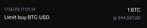Needing to act quickly, I resorted to purchasing Bitcoin via my Coinbase mobile app. It limited my transfers to no more than $100,000 every 24 hours. I managed to buy one Bitcoin at $94,587—missing the lower price I had hoped to lock in.